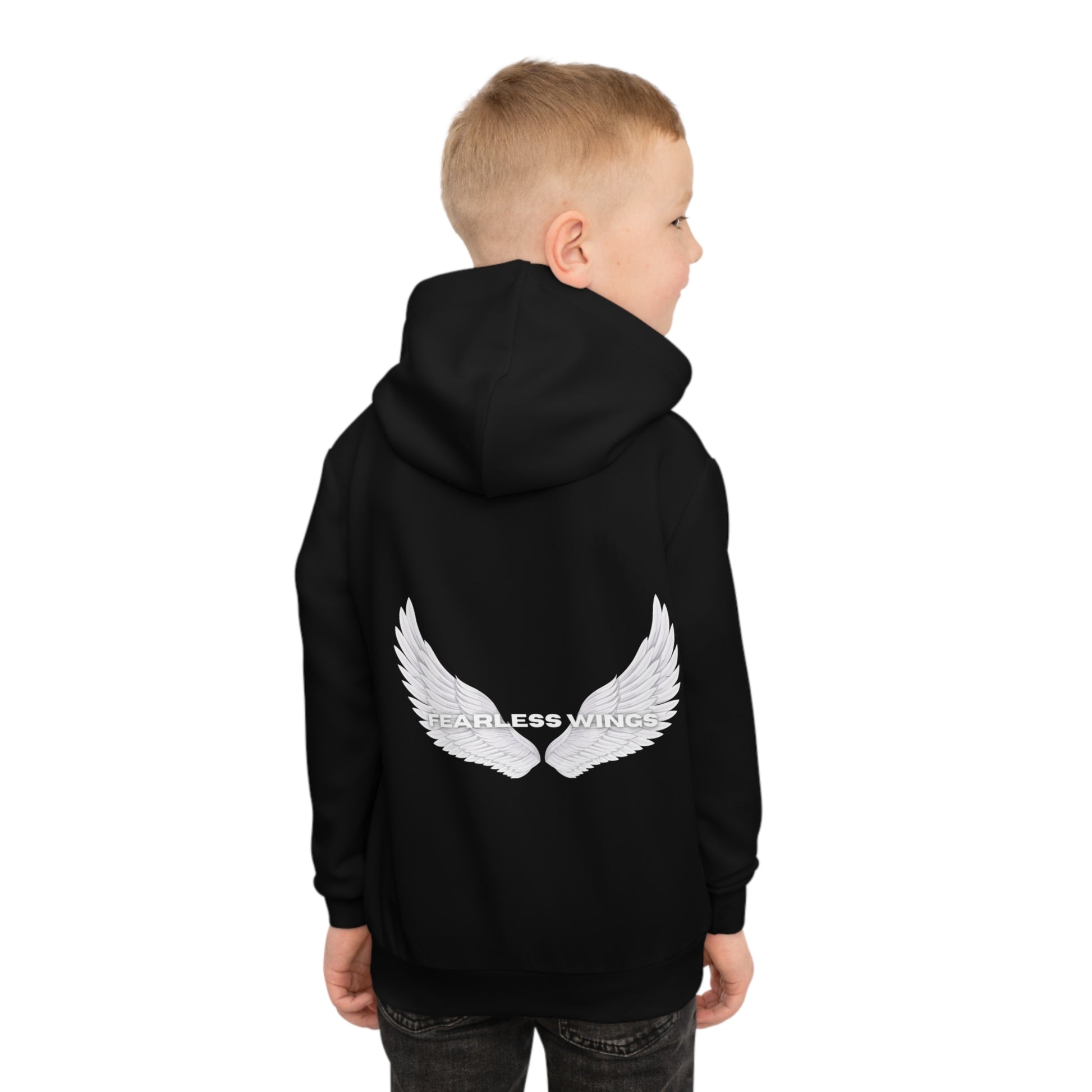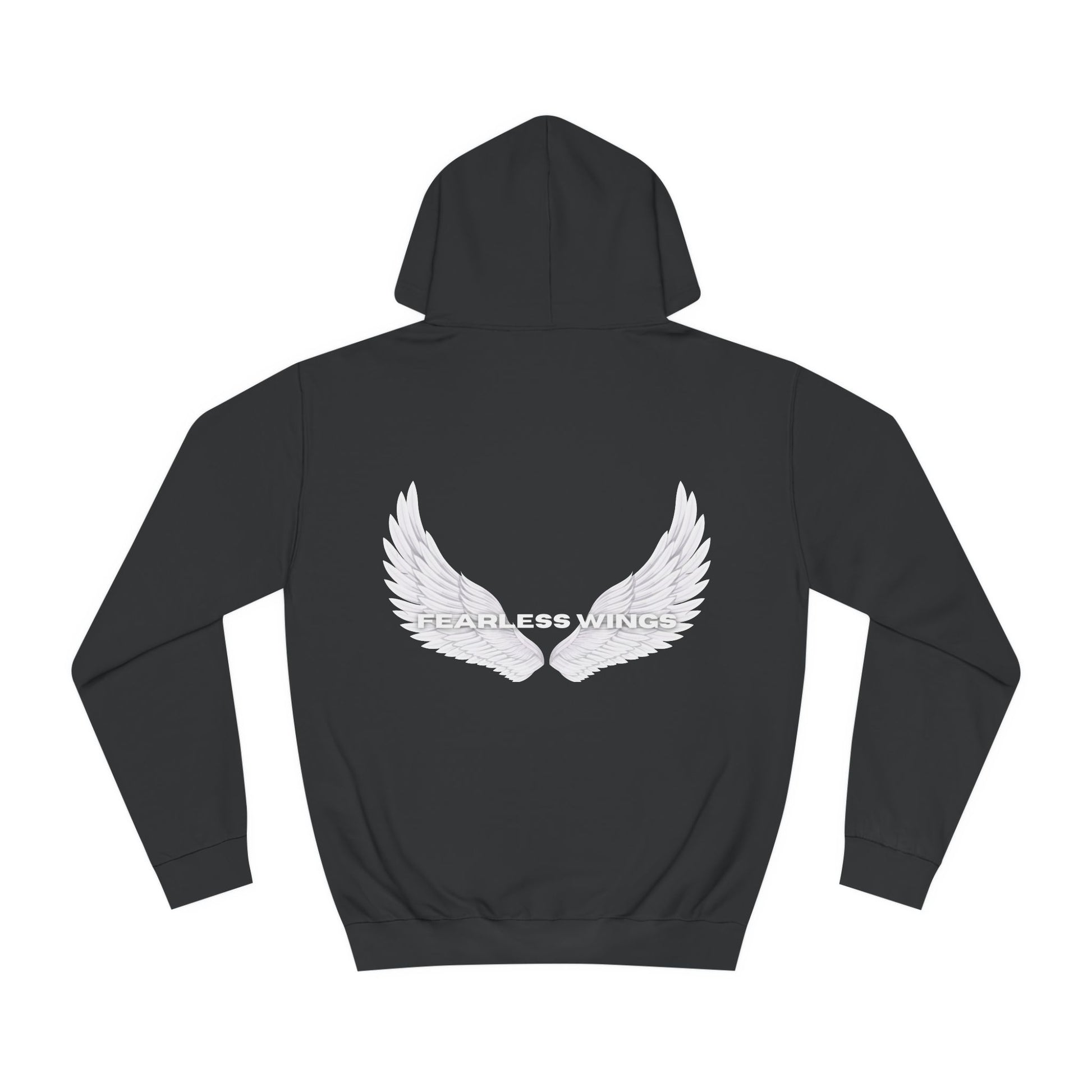 Fearless Wings en unik design på ryggen som symboliserar styrka och frihet. Logotypen på framsidan är broderad. Hoodie är skapad av ett högkvalitativt material med en mjuk fleece insida.